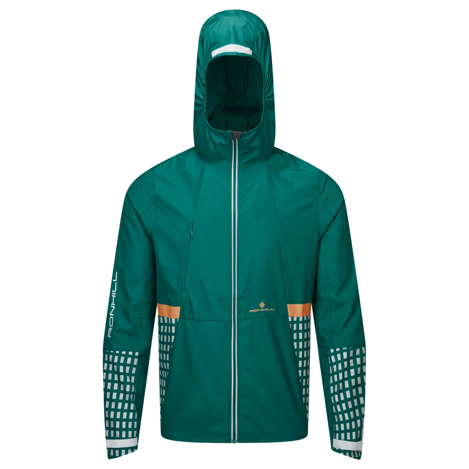 You want to keep moving after dark, and we’re with you. Getting a highly visible and lightweight jacket specifically for runners ‘just right’ is no simple feat. Highly reflective, lightweight and wind resistant, the Nightrunner jacket balances these three deceptively simple benchmark attributes with ease. It’s the perfect protective outer layer for running in the cooler months. This low light running staple is both hardworking and a little bit flashy. Ronhill have been pioneering and reworking the use of reflective materials since the 1980’s, ensuring practical expertise in every stitch. They understand the need for quality running gear that keeps you safe in low light. The jacket features a new iridescent reflective strips and a 360º reflective print. A roll away hood provides extra protection from the elements, and a secure pocket provides somewhere to keep keys, and a parkrun barcode.